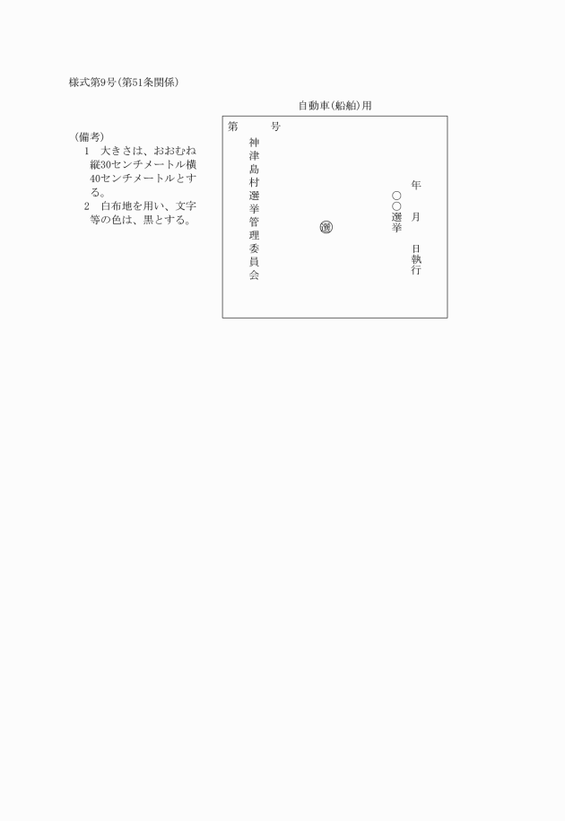 第3条 選挙長が行う告示は、神津島村公告式条例(昭和25年神津島村条例第47号)の例による。ただし、この方法で行うことができないときは、その事務を行う場所の前の掲示場又は公衆の見やすい場所に掲示してこれに代えることができる。