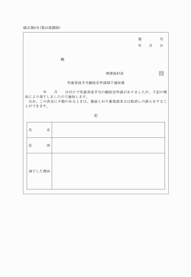 3 村長は、手当額の改定の申請があった場合において、改定すべき事由がないと認めたときは、児童育成手当額改定申請却下通知書(様式第6号)により当該申請をした者に通知する。