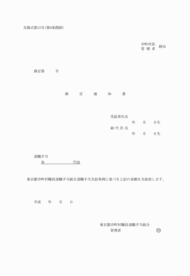 第9条 組合管理者は、退職手当の請求書を受けたときは、これを審査し書類に不備の点がなく、受給権があると認めたときは、裁定通知書(支様式第15号)を退職当時所属していた組織団体の長を経て請求者に交付する。