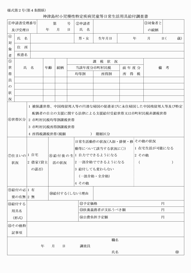第3条 用具の給付を希望する対象者の保護者(以下「申請者」という。)は、神津島村小児慢性疾病児童等日常生活用具申請書(様式第1号。以下「申請書」という。)に小児慢性特定疾病医療受給者証の写しを添えて村長に申請するものとする。