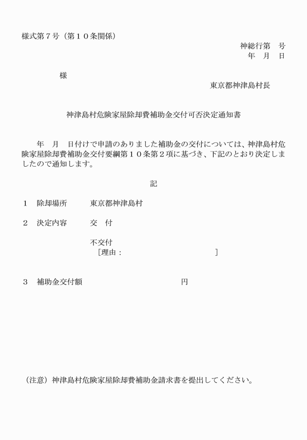 神津島村危険家屋除却費補助金交付内定申請書 | ・案内図 ・除却工事見積書(写) ・除却工事前写真 ・その他村長が必要と認めるもの |
