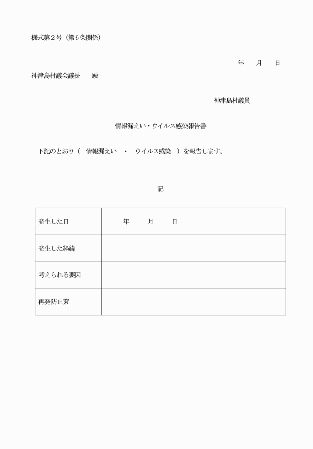 (3) 個人情報の漏えい若しくはコンピュータウイルス感染があったとき又はそのおそれがあるときは、速やかに事実関係を把握するとともに、情報漏えい・ウイルス感染報告書(様式第2号)により、直ちに議長に報告し、必要な措置を講じること。