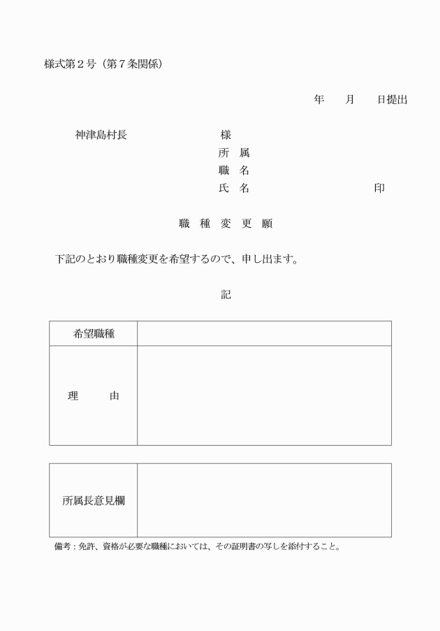 第7条 職員が職種変更を希望する場合は、各所属長及び人事を担当する課長を経由して、村長に職種変更願(様式第2号)を提出するものとする。この場合において、職種変更をする職種に資格等を要する場合には、その資格等の証明書等の写しを添付しなければならない。
