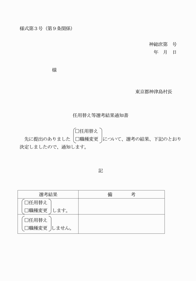 第9条 村長は、任用替え等の選考を行ったときは、任用替え等選考結果通知書(様式第3号)により、当該職員に通知するものとする。